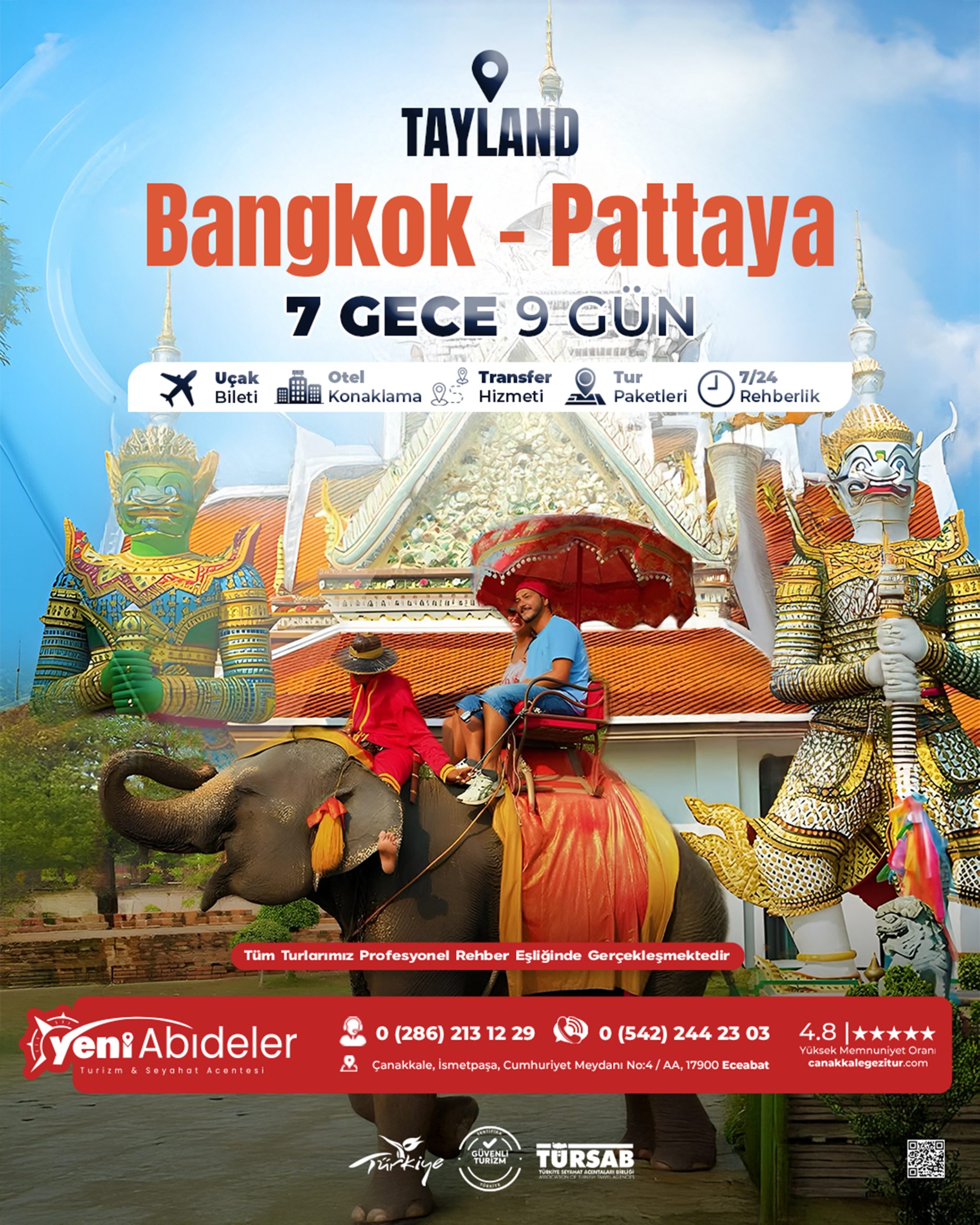 Sabah uçakta alacağımız kahvaltımızın ardından yerel saat ile 08:20’de Bangkok Suvarnabhumi Havalimanına varış. Alanda bekleyen rehberimiz ile buluşma ve özel araçlarımız ile Bangkok şehir turu için hareket, yapılacak olan Bangkok panoramik şehir turunda Altın Buddha tapınağı, çiçek pazarı, Çin mahallesi, parlamento binası, demokrasi anıtı görülecek yerlerden bazılarıdır. Bu turumuz esnasında hem Bangkok'un egzotik güzelliğini hem de Tayland'ı derinden etkileyen Budizm’i daha yakından tanıma fırsatımız olacaktır. Tur bitiminde otelimize transfer, oda dağılımı ve yerleşmenin ardından dileyen misafirlerimiz ekstra olarak düzenlenecek olan Bangkok Kanallar turumuza katılabilirler. Akşam dileyen misafirlerimiz ekstra olarak düzenlenecek olan Baiyoke turumuza katılabilirler. Extra Tur : Bangkok Kanallar Turu Kişi Başı 25 Euro Bu tura katılmadan Bangkok görülmüş sayılmaz. Turumuz esnasında Bangkok’un tarihi kanallarında özel teknemiz ile dünyanın hiçbir yerinde göremeyeceğiniz ilginç manzaraları görme fırsatı. Tay’lıların kanallar üzerindeki yaşamını yakından tanıyacak, Tayland’ın zengin ile fakir kesiminin kaynaşmasına şahit olacaksınız. Tapınaklardan birinin önünde kutsal kedi balıklarını besleyeceğiz. Extra Tur : Akşam Yemekli Baiyoke Sky Turu & Asiatique Riverfront Gece Pazarı Turu Kişi Başı 50 Euro Bu turumuzda 309 Metre yüksekliği ile Baiyoke Sky Tayland’ın 85 katlı en uzun binasıdır. Binanın 77. Katında bulunan 360 derece tüm şehri görebileceğiniz restoranda müthiş manzaraya karşı açık büfe akşam yemeği. Ardından tarihi Siam Krallığına dayanan ,okyanus ötesi Avrupalı ülkeler ile Tayland arasında ilk ticaretin yapıldığı bölgede inşa edilmiş ,tarih ve modernizmin iç içe geçtiği , içerisinde 1500’den fazla dükkan ve restaurant ile ,Bangkok’un en yeni eğlence merkezi olan Asiatique gidiyoruz. Alışveriş için serbest zaman ve ardından otelimize transfer